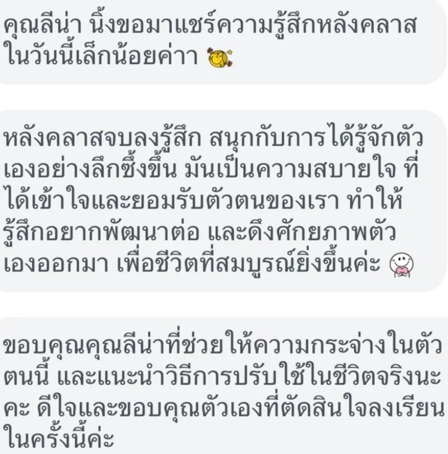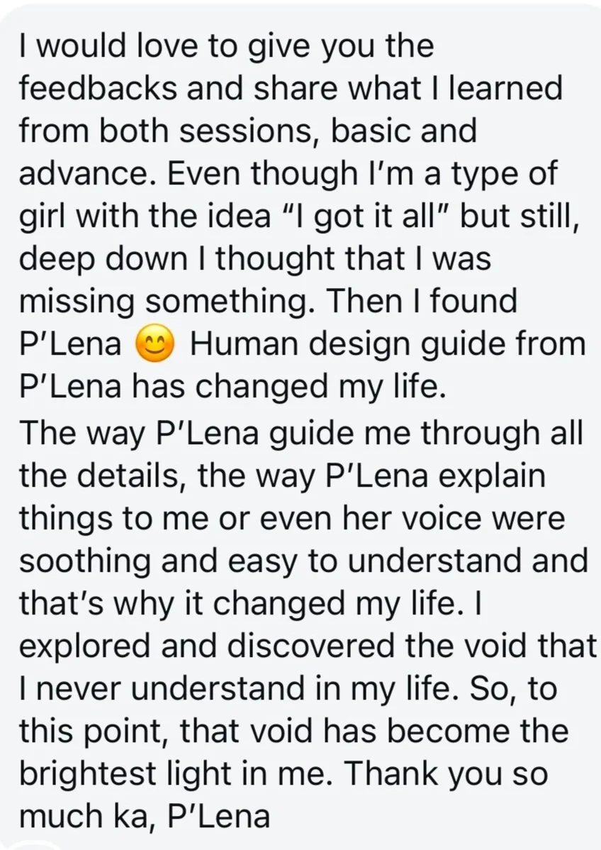 ครั้งแรกที่ได้รู้จักกับ Human Design ลีน่ารู้สึกได้เห็นตัวเองอย่างแท้จริง ทำให้ปล่อยวางได้กับหลายๆ คำถาม ความสงสัย การวิจารณ์ตนเอง เมื่อรู้ว่า “ตัวเรานั้นสมบูรณ์แบบแล้วในสิ่งที่เราเป็น” ยิ่งไปกว่านั้นยังการค้นพบ Human Design ทำให้ลีน่ารู้สึกมีพลังในการแสดงความเป็นตัวเองออกมาได้อย่างเต็มที่ ลีน่าหวังว่า Human Design จะช่วยให้คูณเกิดการเปลี่ยนแปลงในทางที่ดีขึ้นอย่างที่ลีน่าได้ประสบมาเช่นกัน